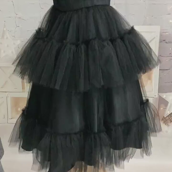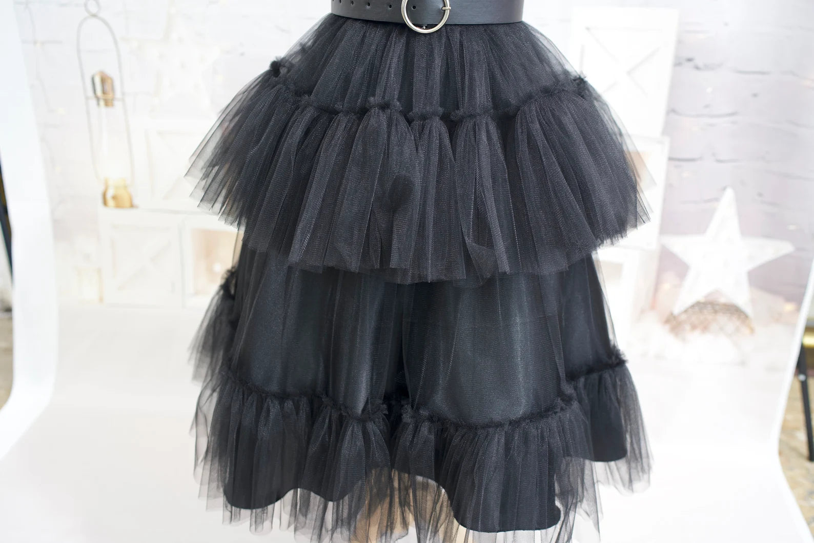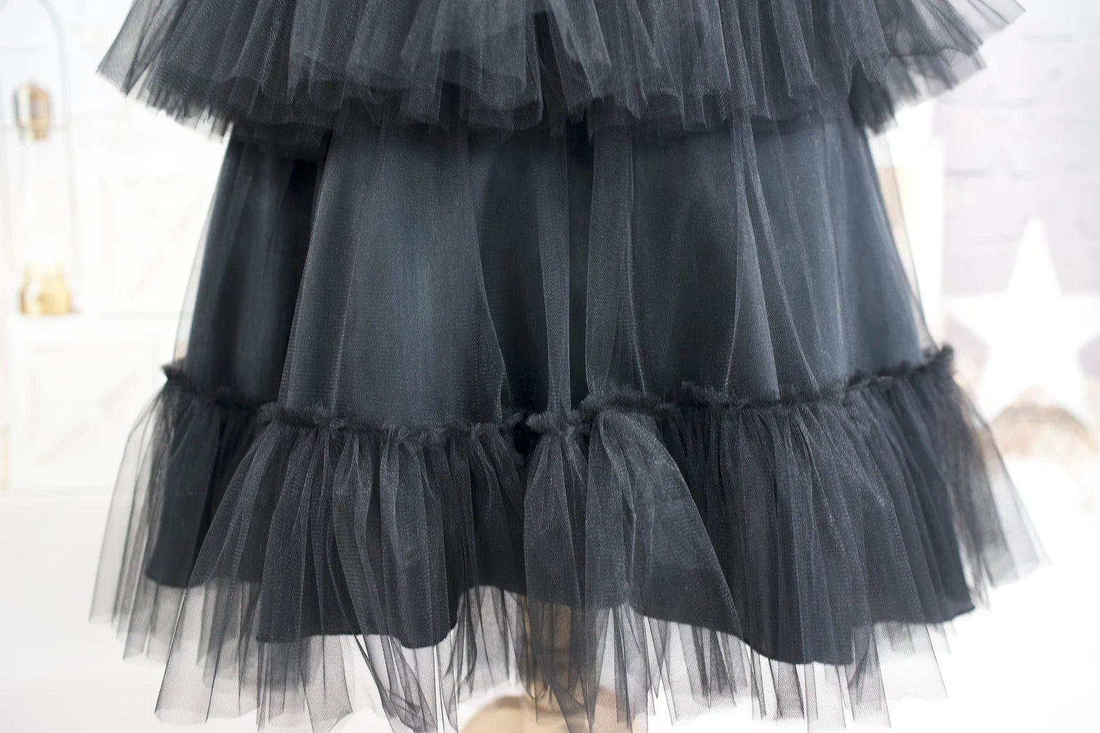 Bring Wednesday’s iconic gothic style to life with this black tulle costume dress, designed for girls, teens, and kids. Inspired by the mysterious world of Nevermore Academy, this dress features a layered tulle skirt, black collar, and classic button details—perfect for Halloween, cosplay events, or themed parties.