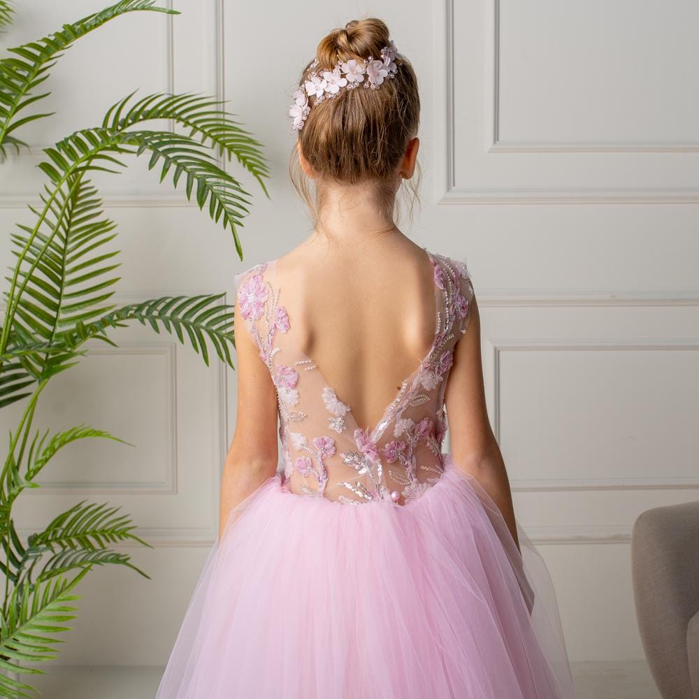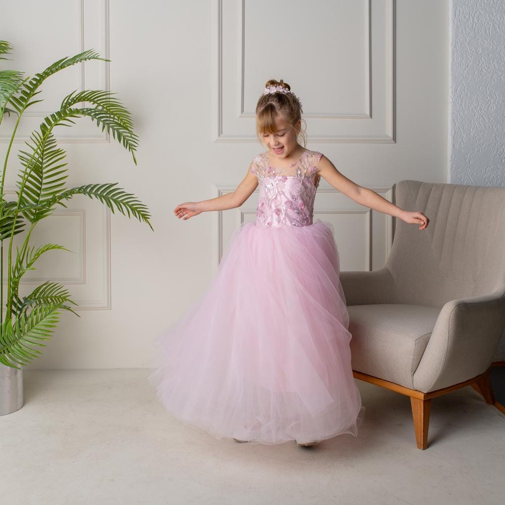 Blush Pink 3D Flower Girl Dress: Tulle & Lace Princess Gown