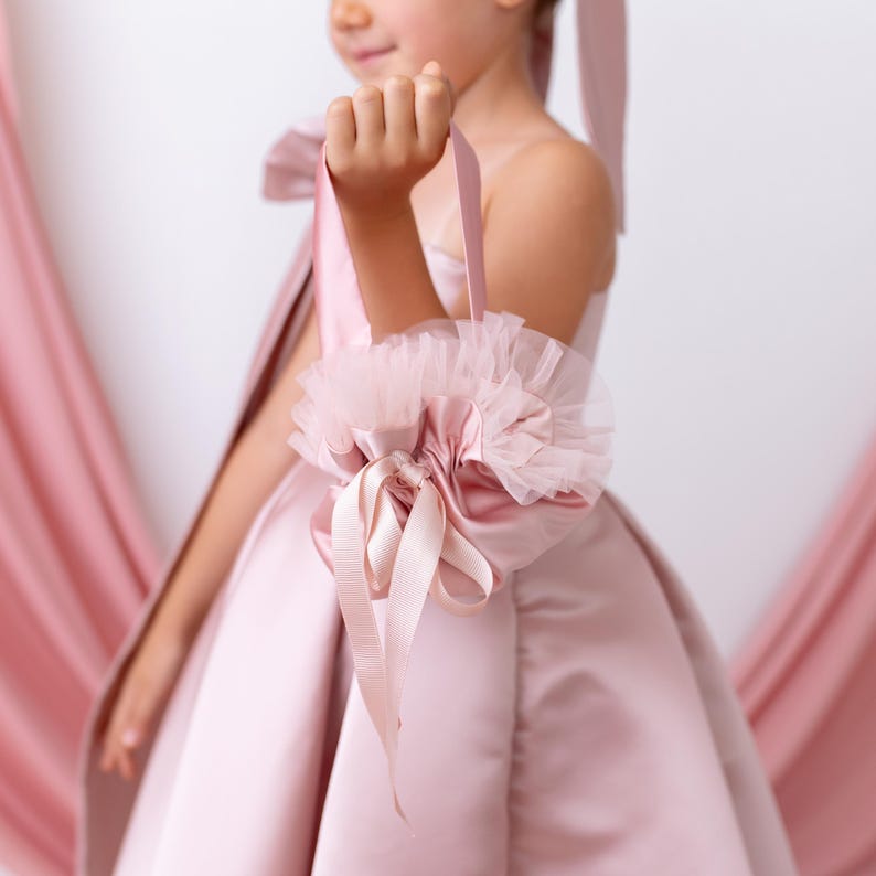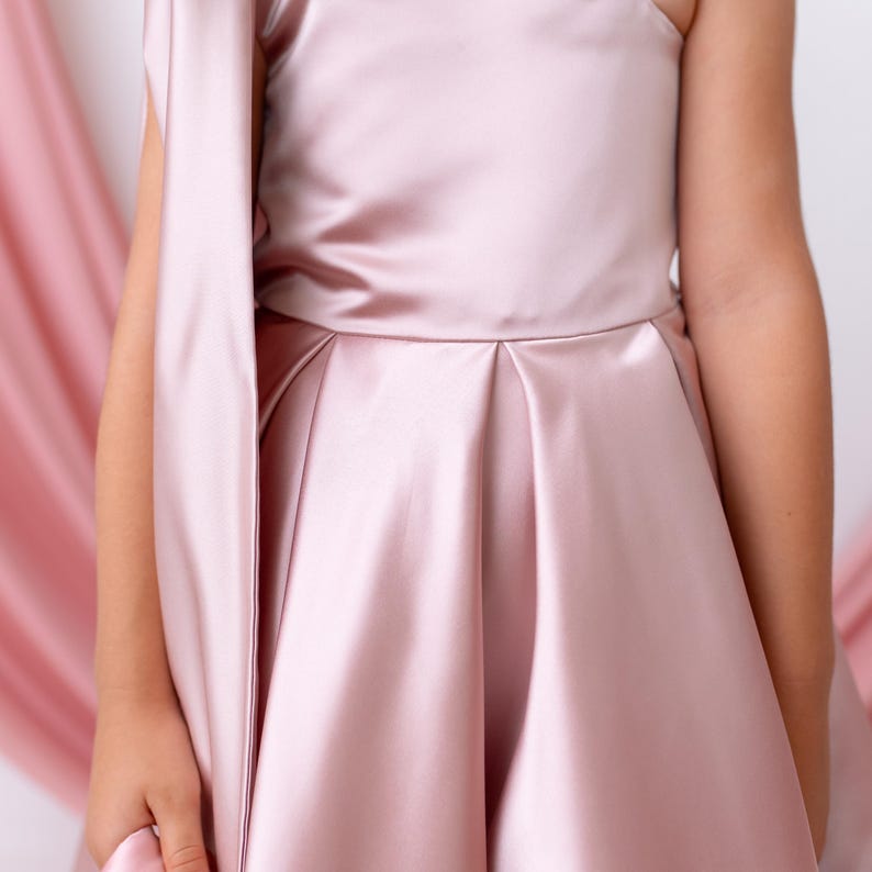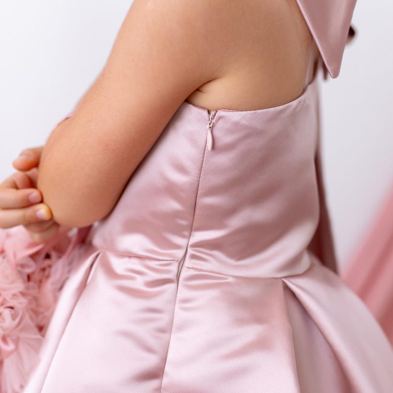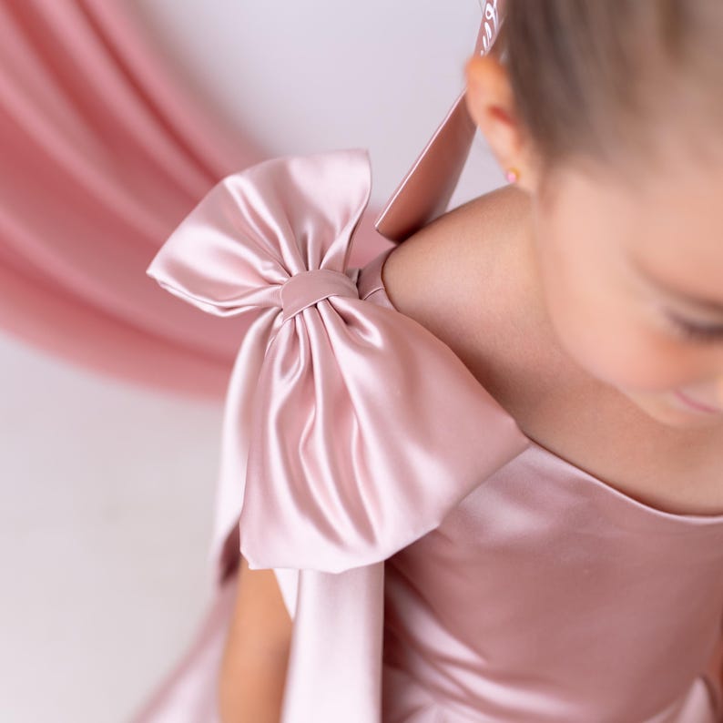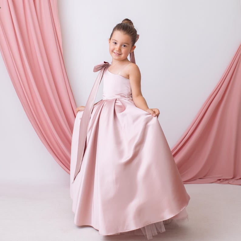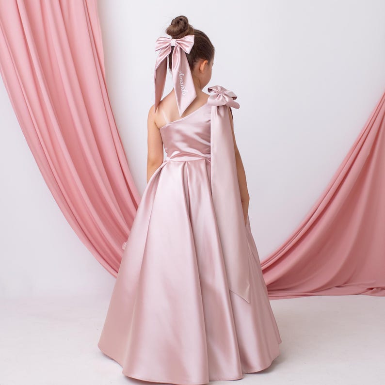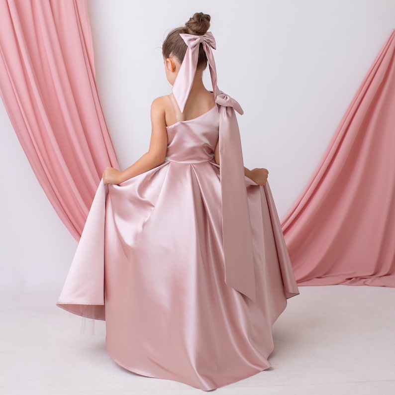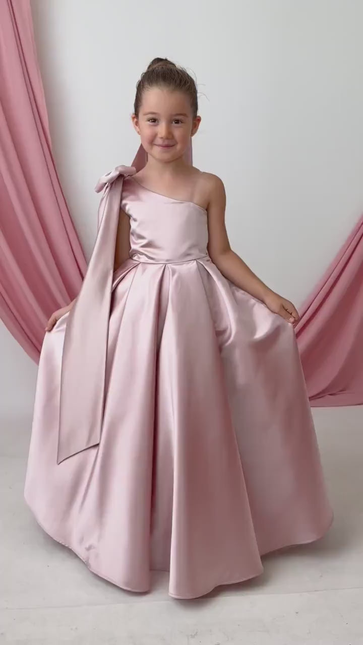 Twirl into pure enchantment with this gorgeous blush satin flower girl dress, designed to make any little one feel like royalty. Its dazzling one-shoulder silhouette and oversized satin bow add a touch of whimsical elegance, perfect for special occasions. Plus, it comes with personalized accessories like a custom hair bow and a delightful mini bag. This luxurious gown ensures comfort and unforgettable moments for your darling.