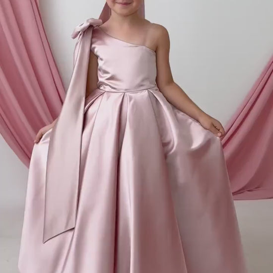 Elegant Blush Satin One-Shoulder Flower Girl Dress with Oversized Bow