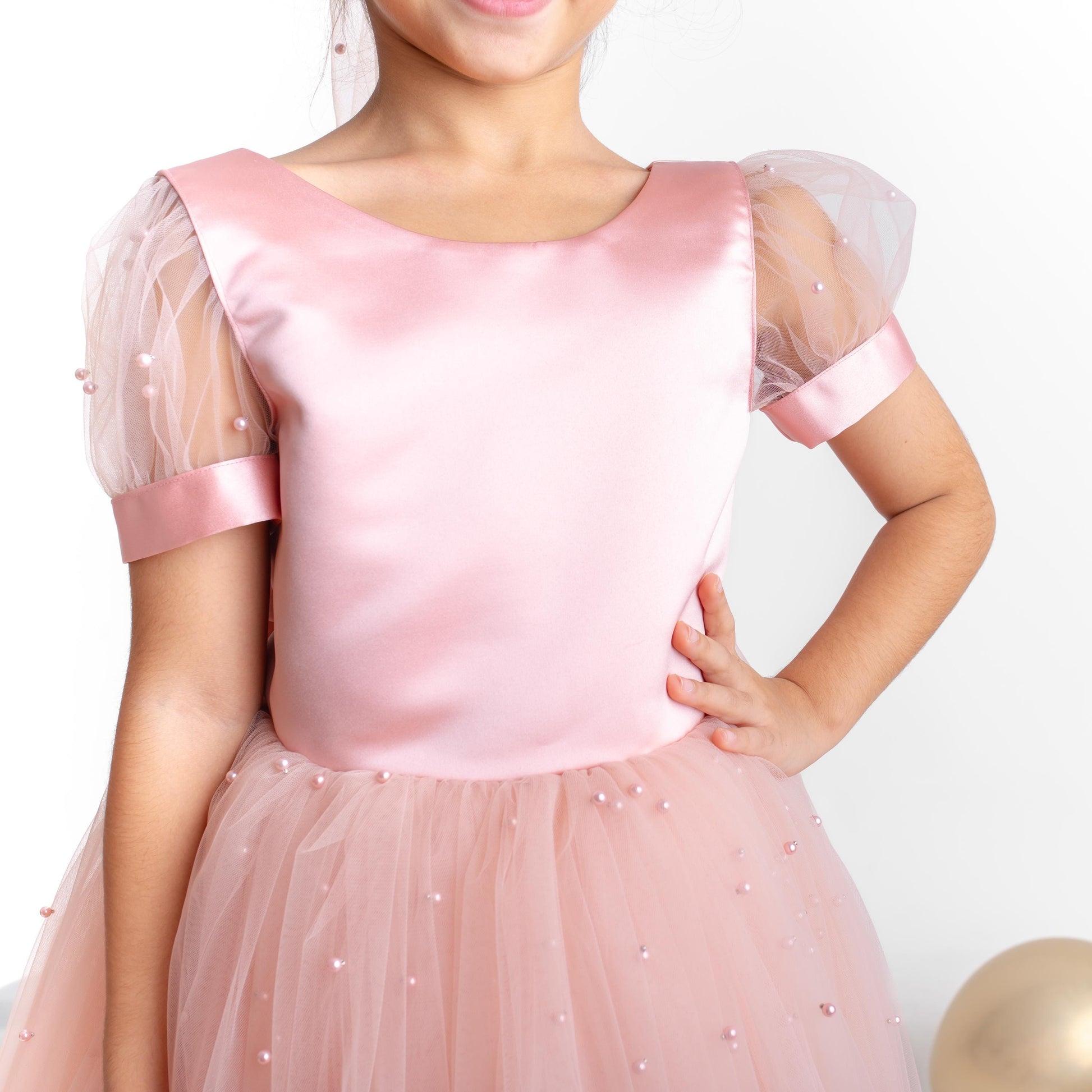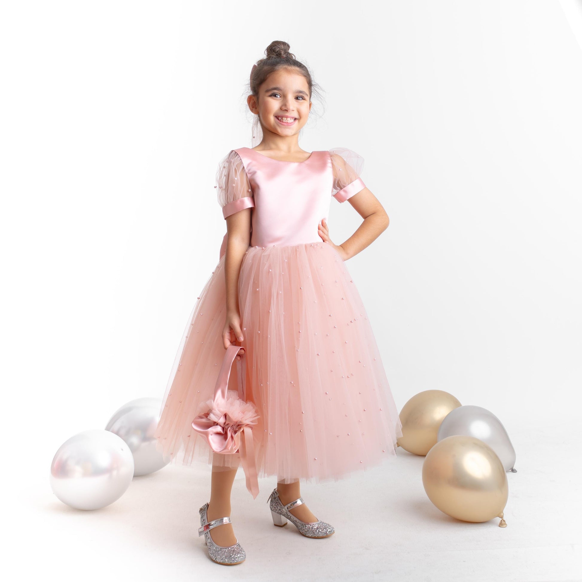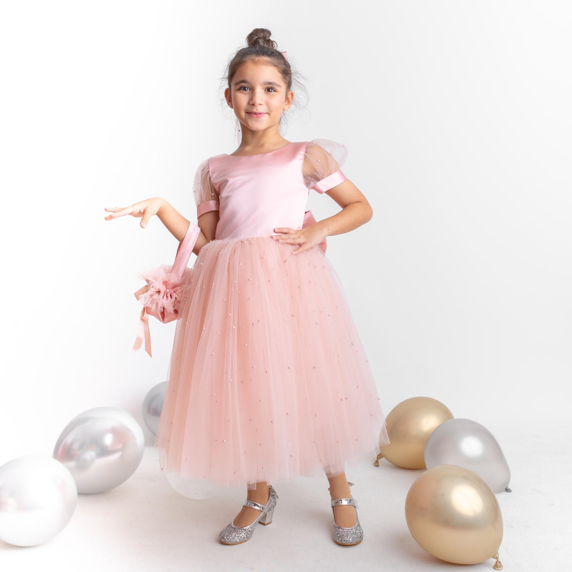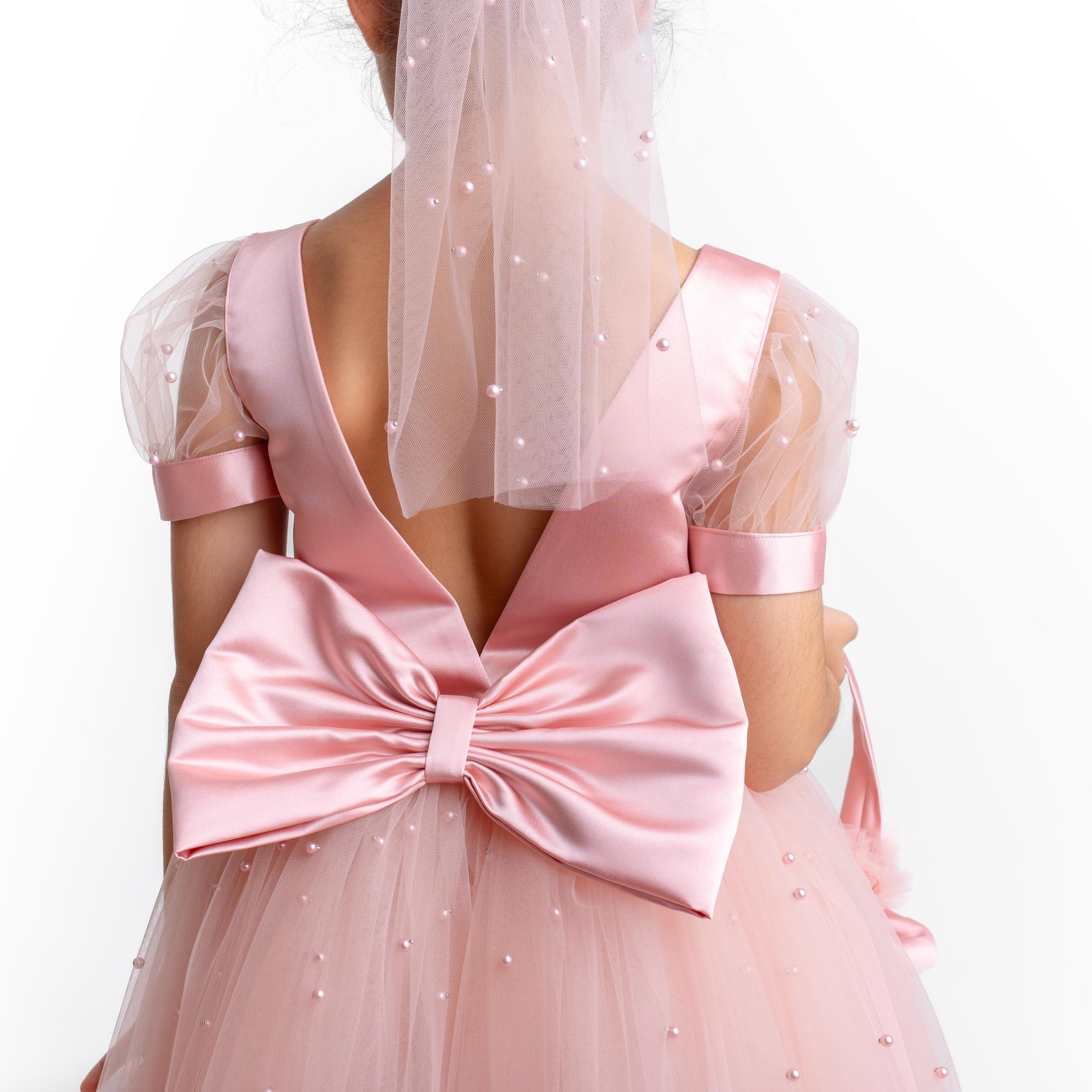 Capture precious memories with this blush pearl tulle dress—a keepsake she’ll remember long after the celebration ends!