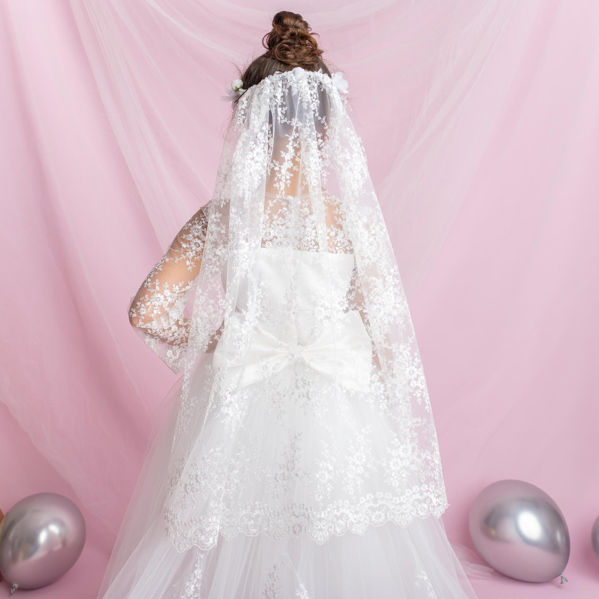 Hand wash gently. Lay flat or hang to dry. Handle lace and train with care.
