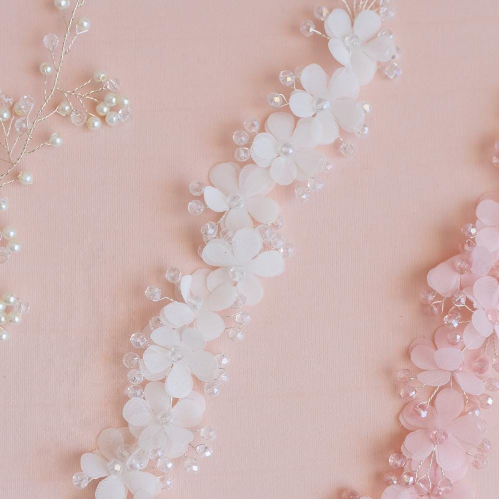 💎 C – White Floral Hair Vine: Handmade with fabric flowers and crystals for a delicate touch.