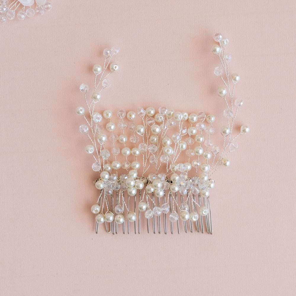 💎 G – Pearl Hair Comb: A chic, handmade pearl and crystal hair comb for extra sparkle.