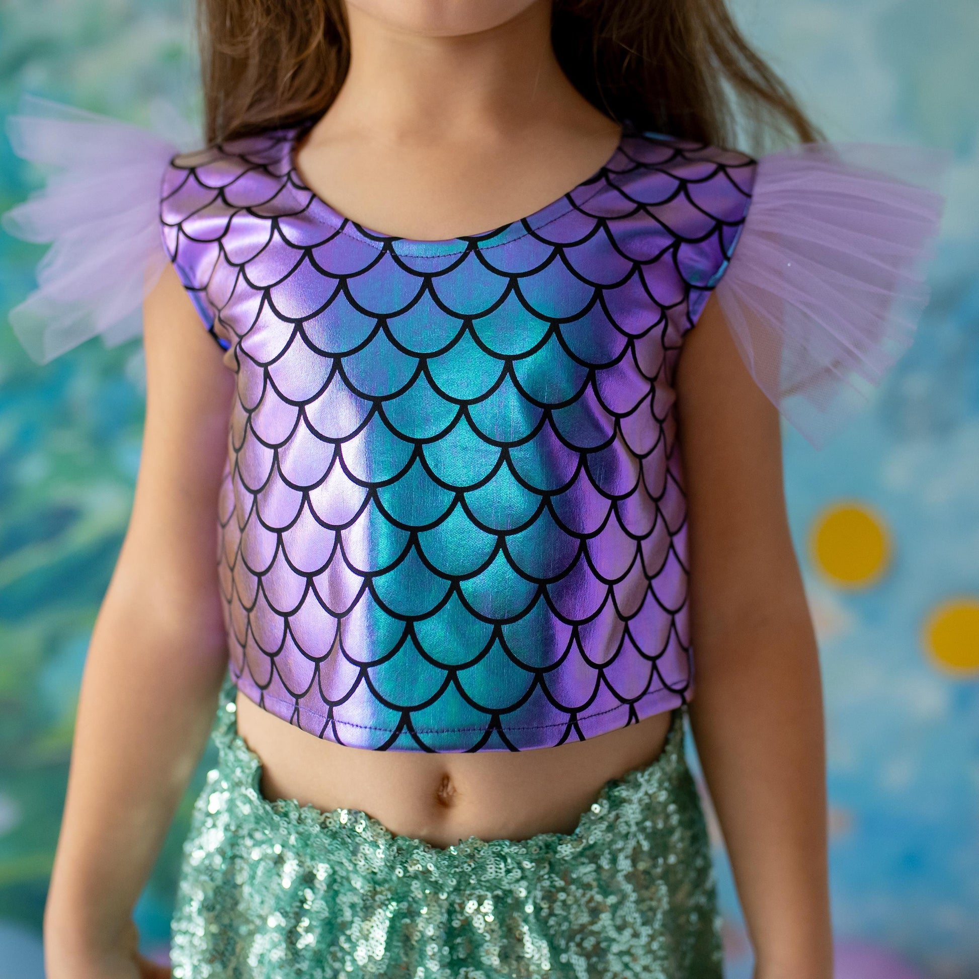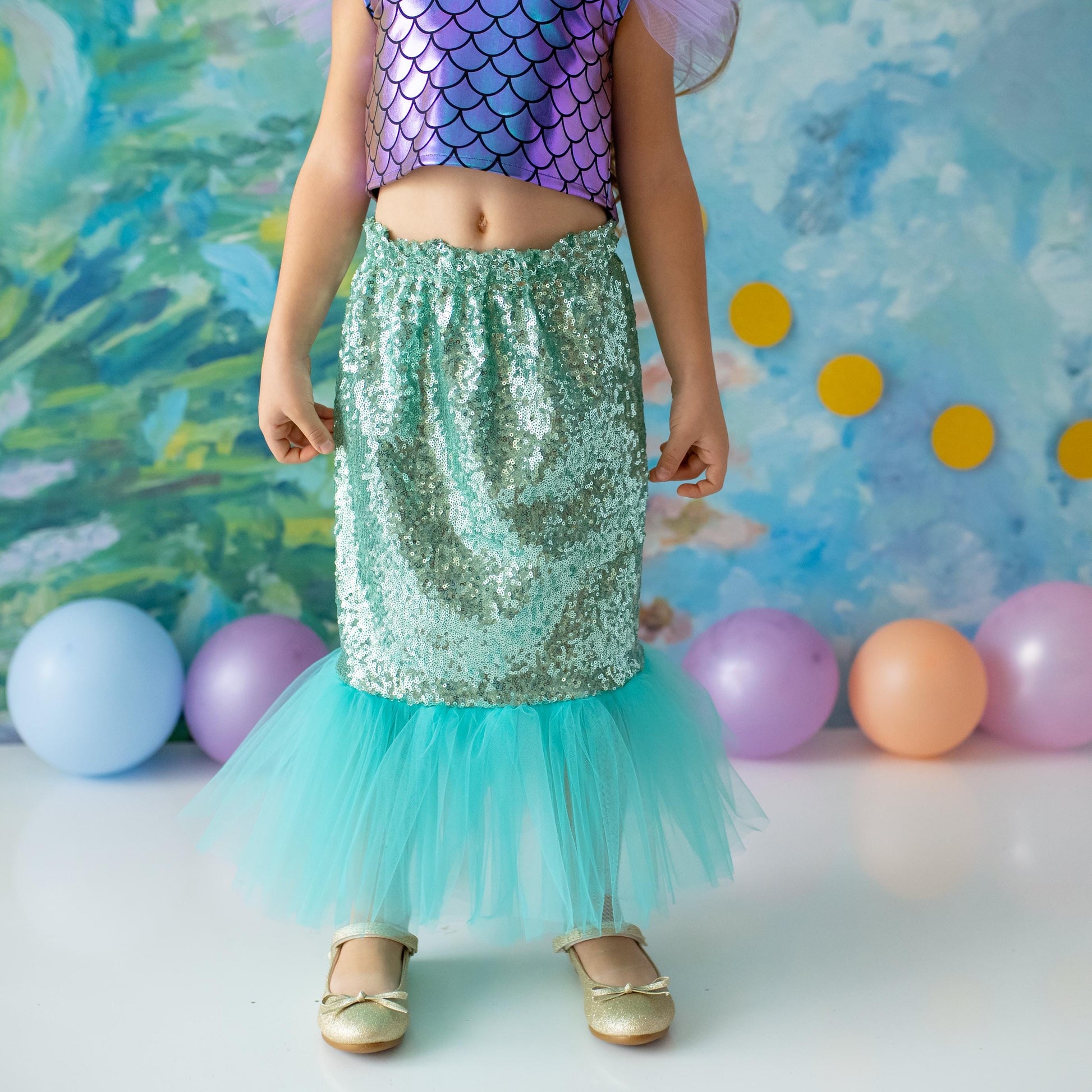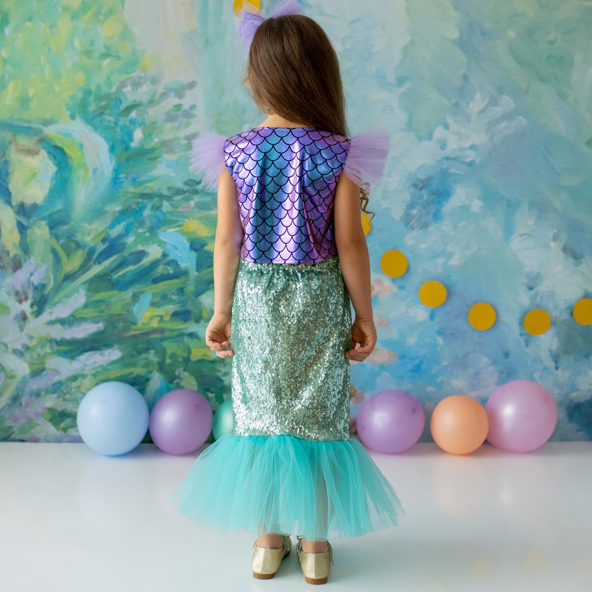 - Shimmery scales and layered tulle skirt for a true mermaid look