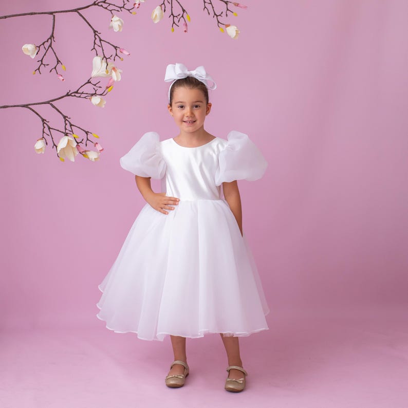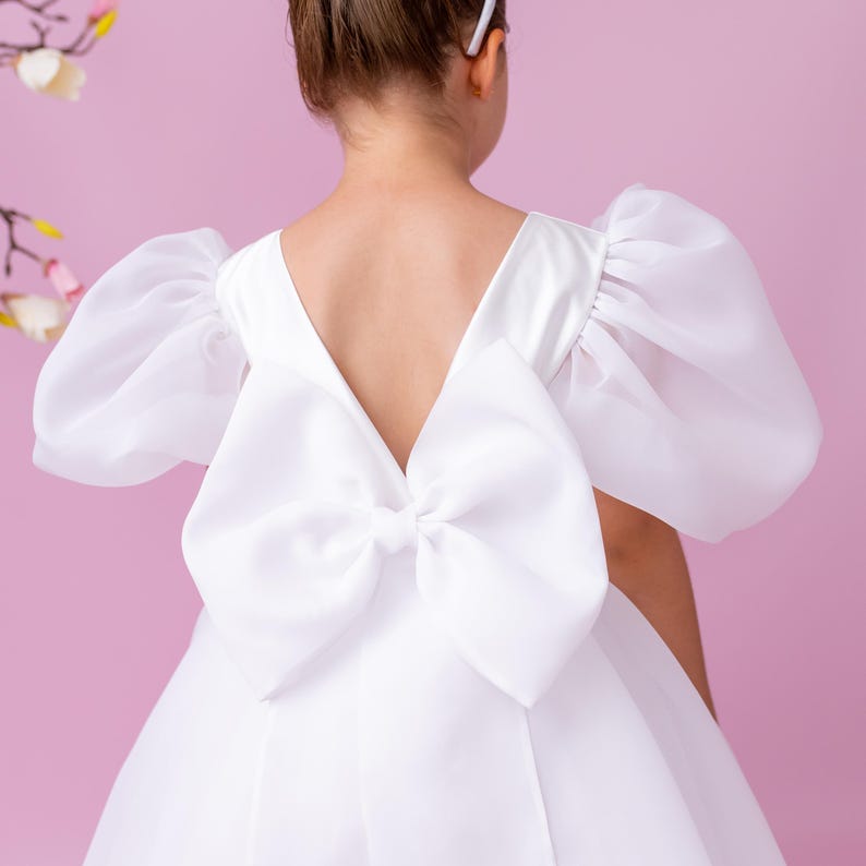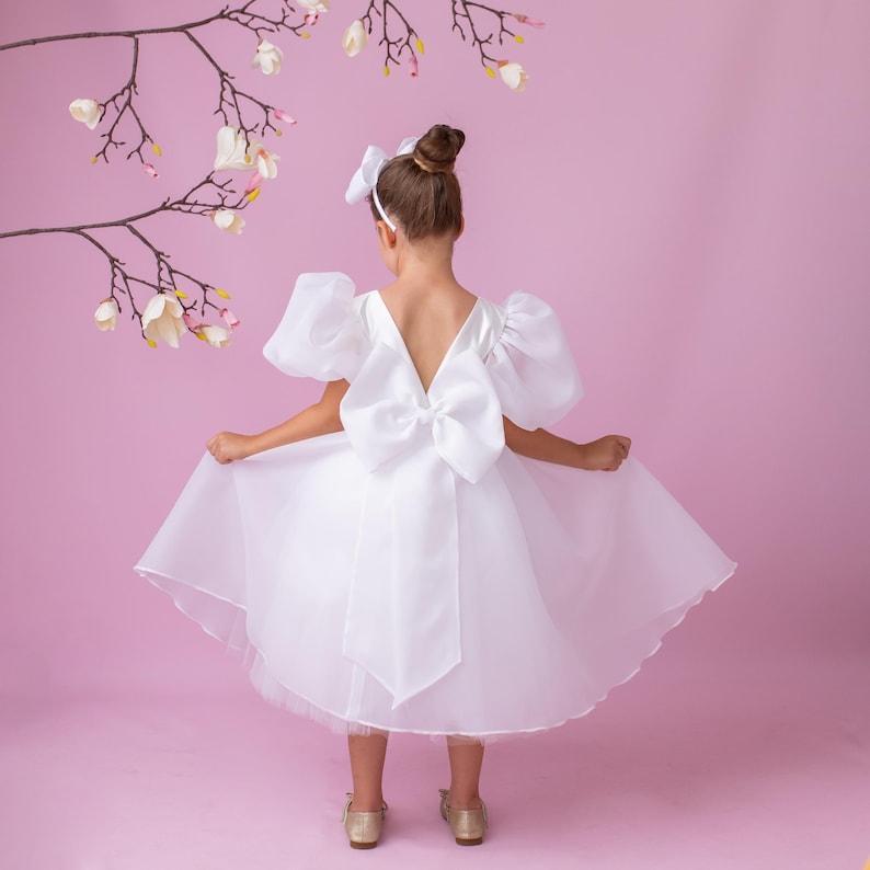 This enchanting organza dress will make your little one feel like royalty at any special event. Its luxurious satin bodice and V-back, adorned with a stunning oversized bow, create a truly magical look. The pure white tea-length skirt allows for twirling fun, ensuring comfort and elegance all day long. Perfect for weddings, communions, or any celebration where a touch of fairy-tale charm is needed.