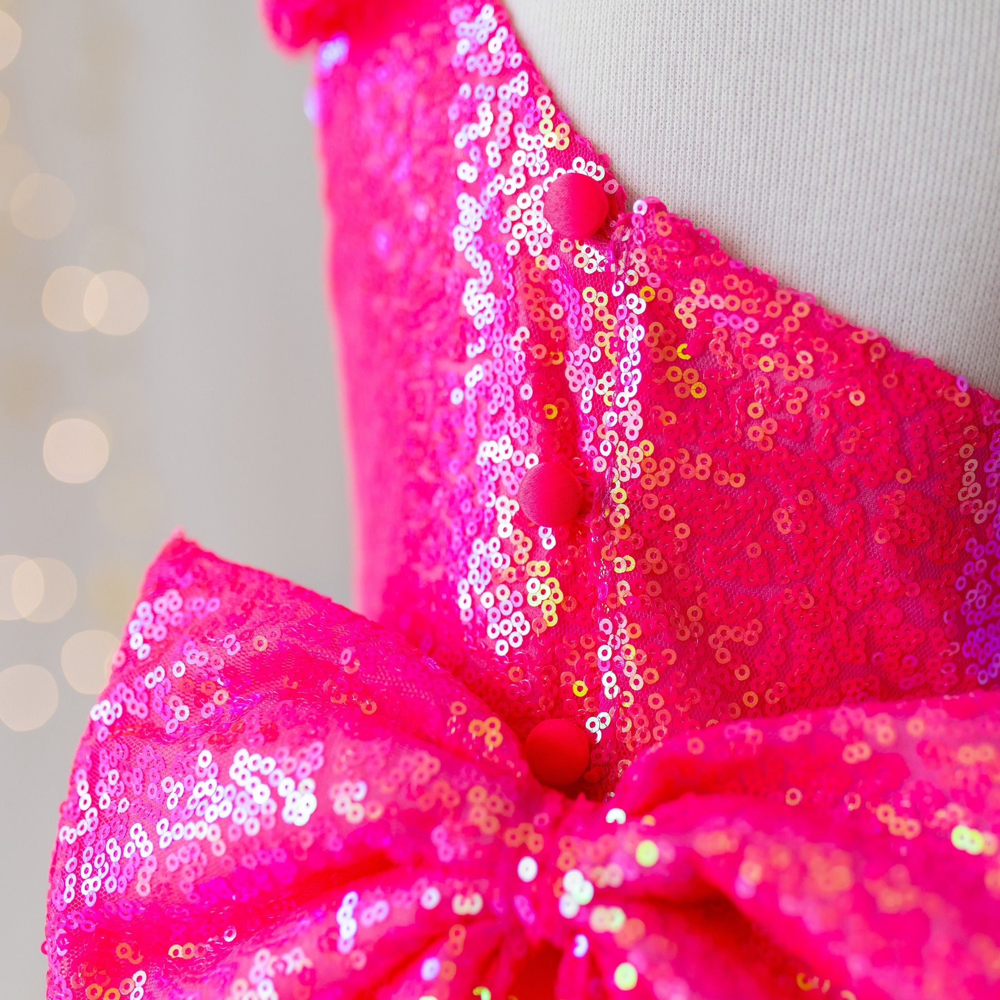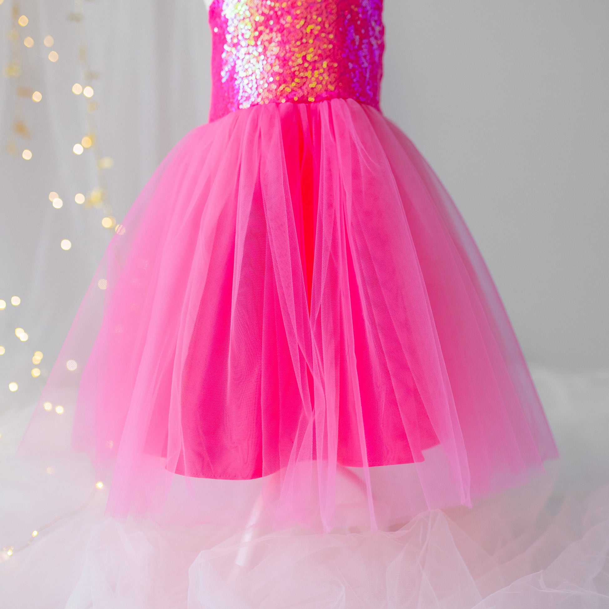 Celebrate in style—add this personalized pink sequin tulle dress to your cart today and make her party dreams come true!
