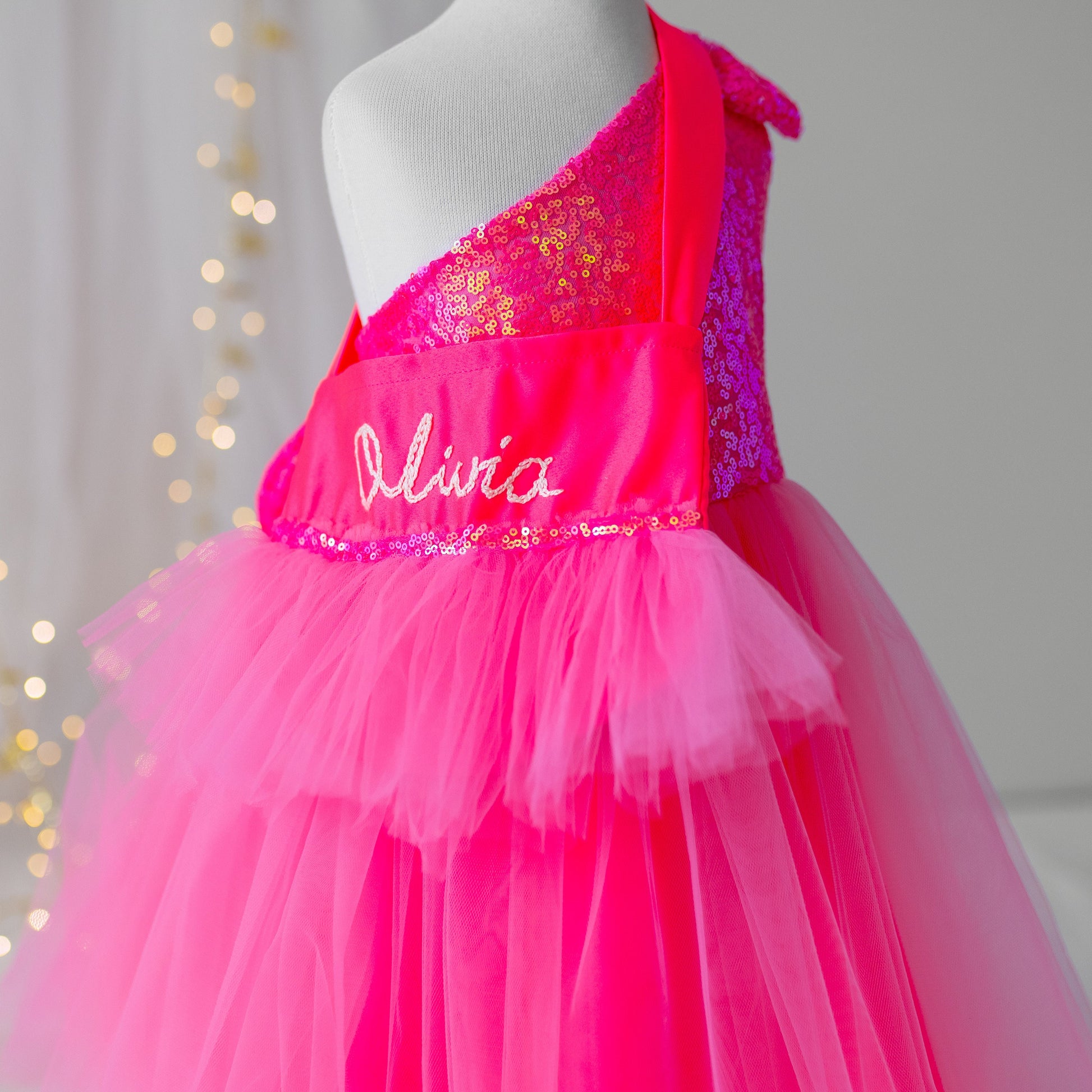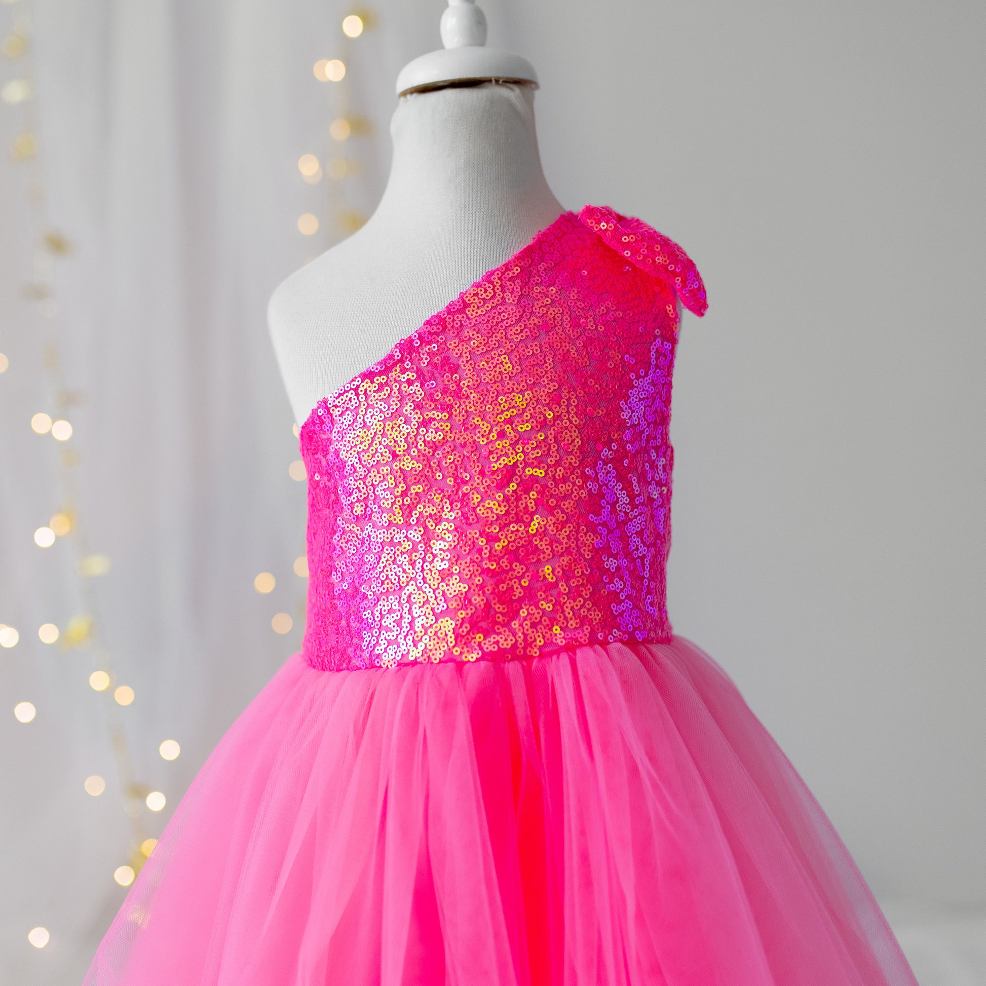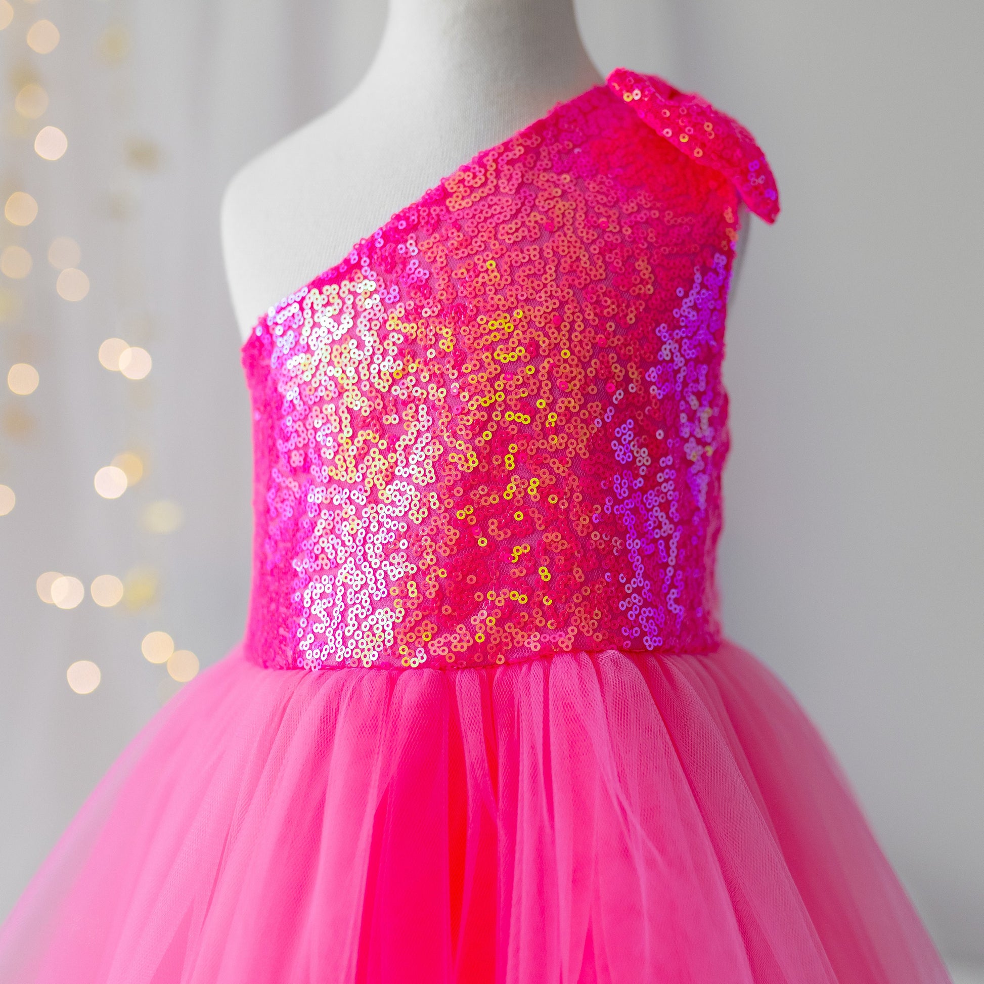 Personalized Pink Sequin Tulle Dress: One-Shoulder Party Outfit