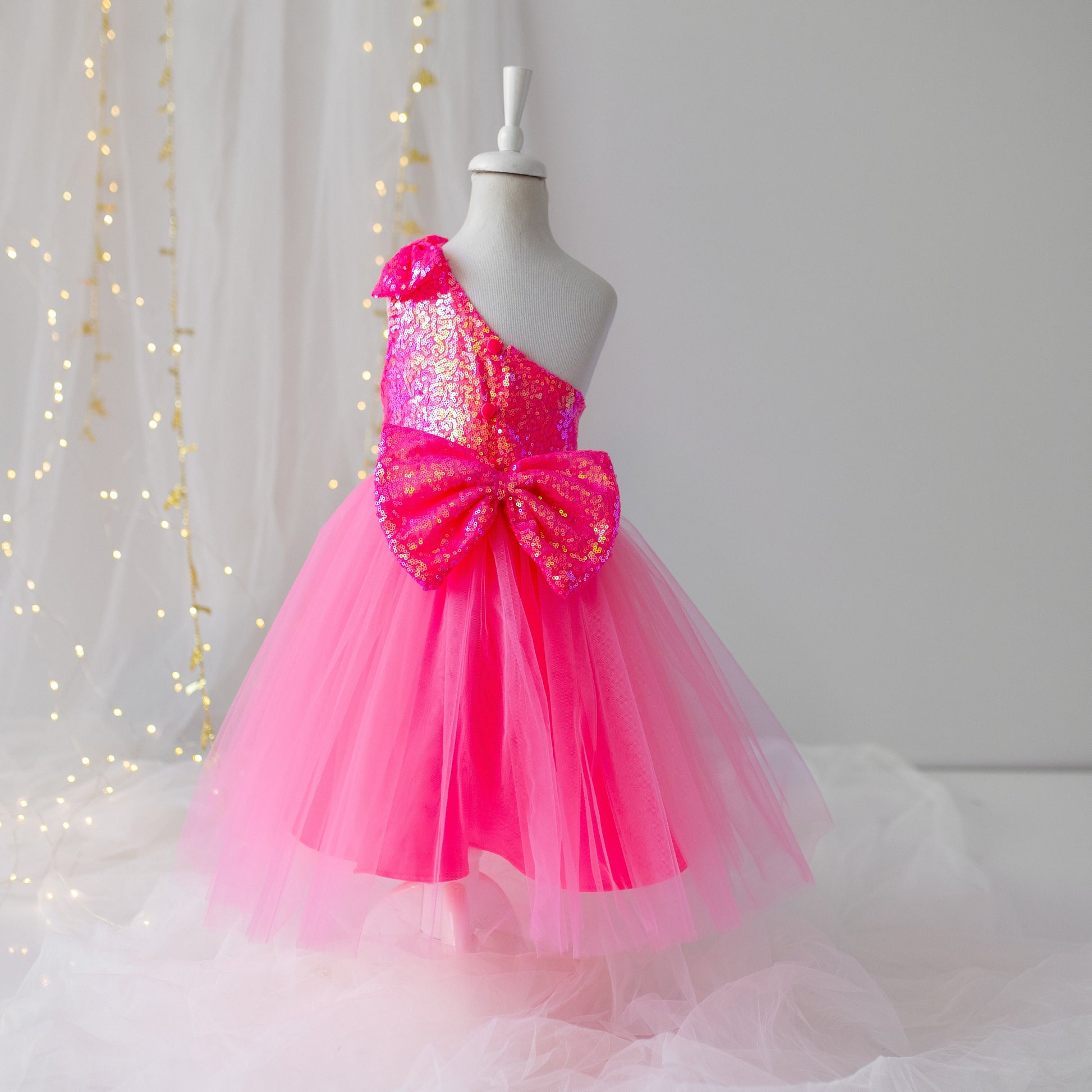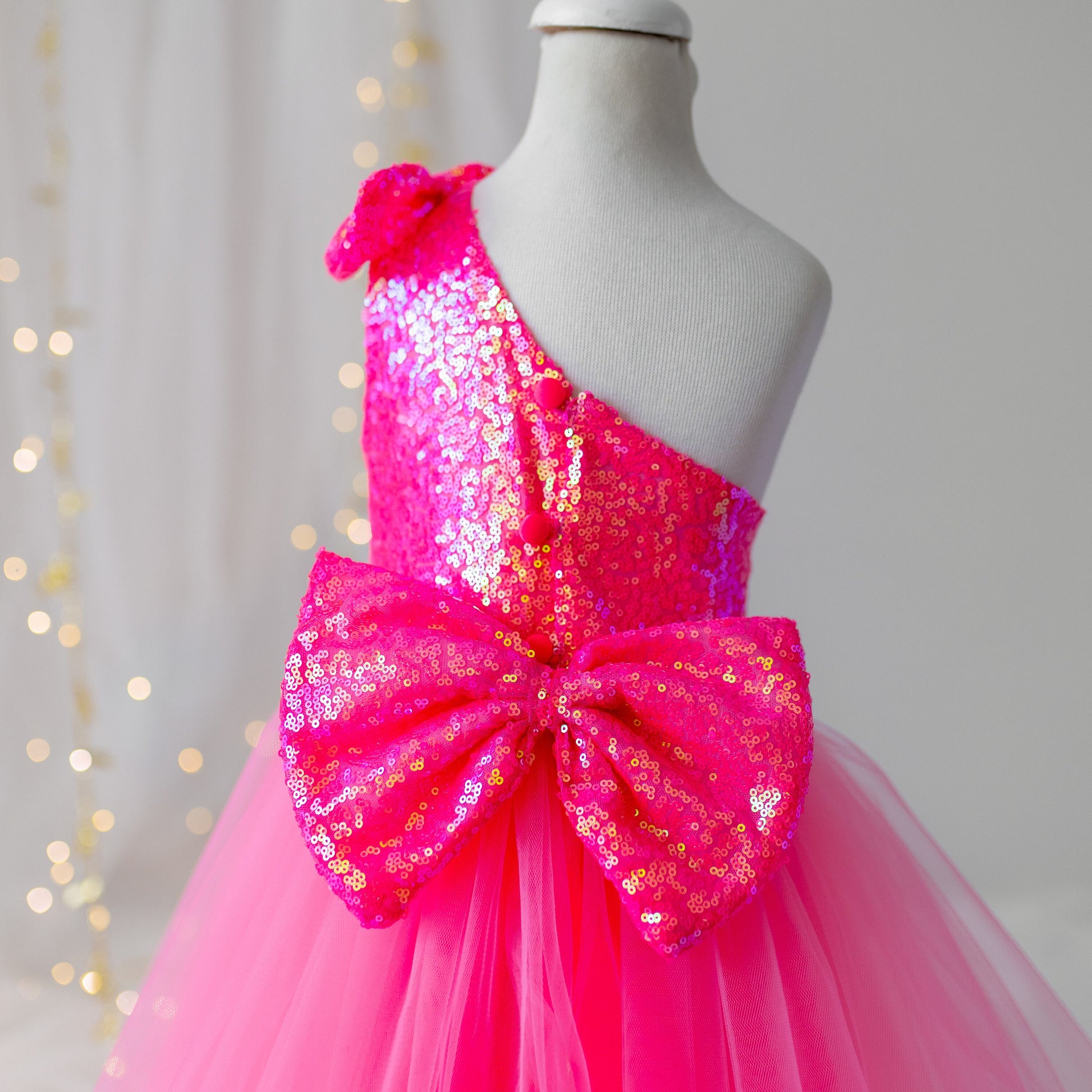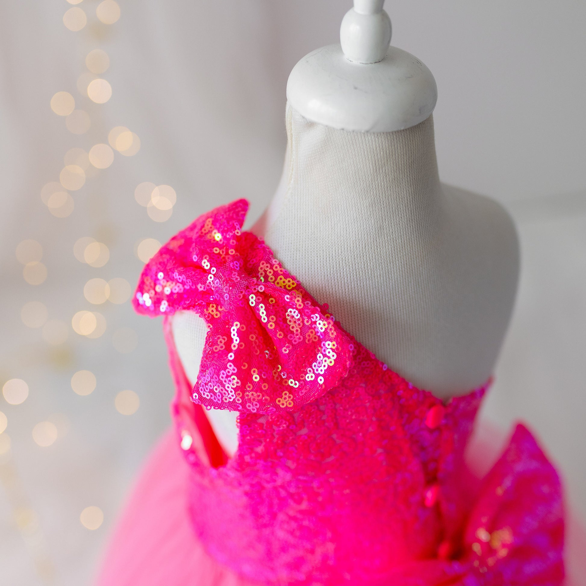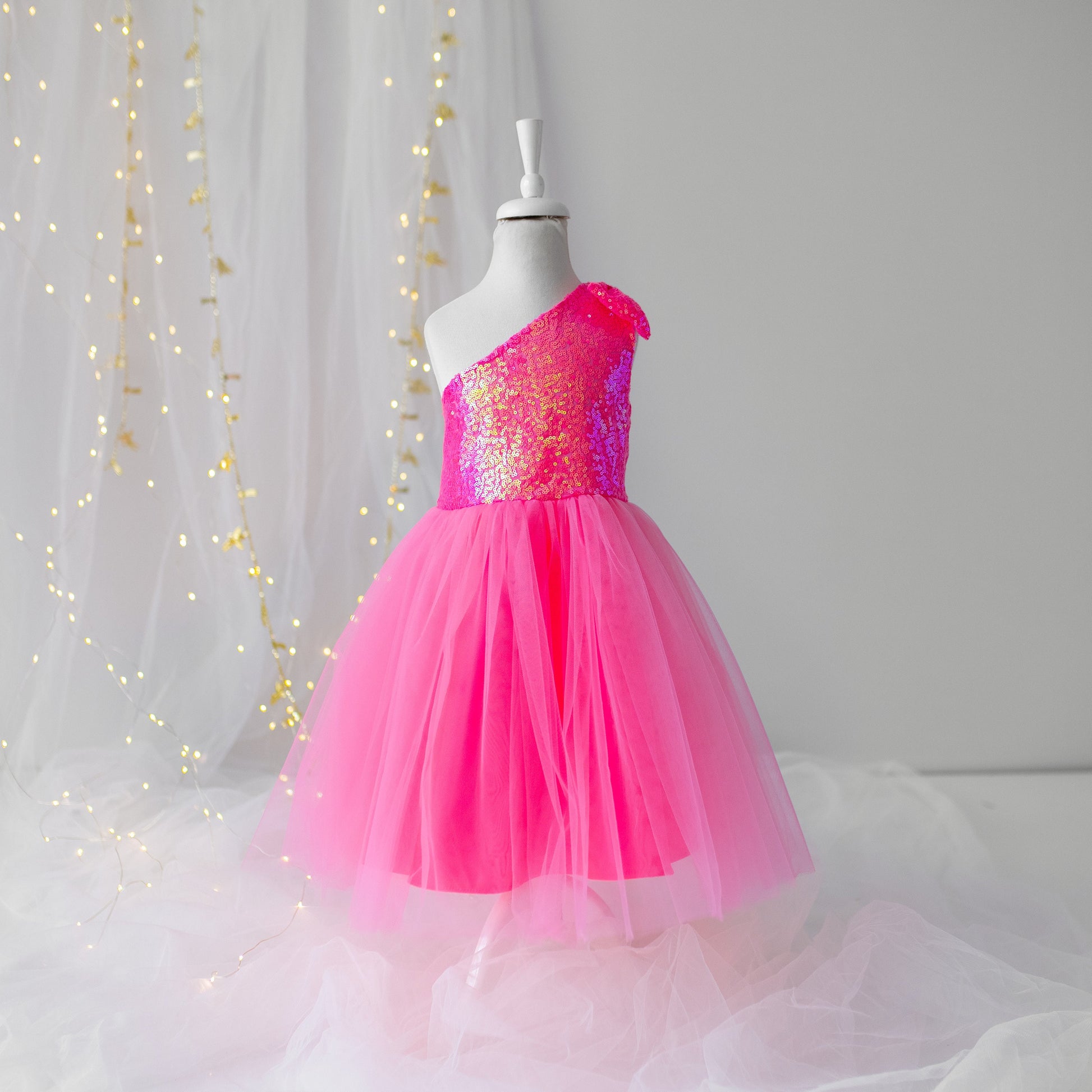 Personalized Pink Sequin Tulle Dress: One-Shoulder Party Outfit