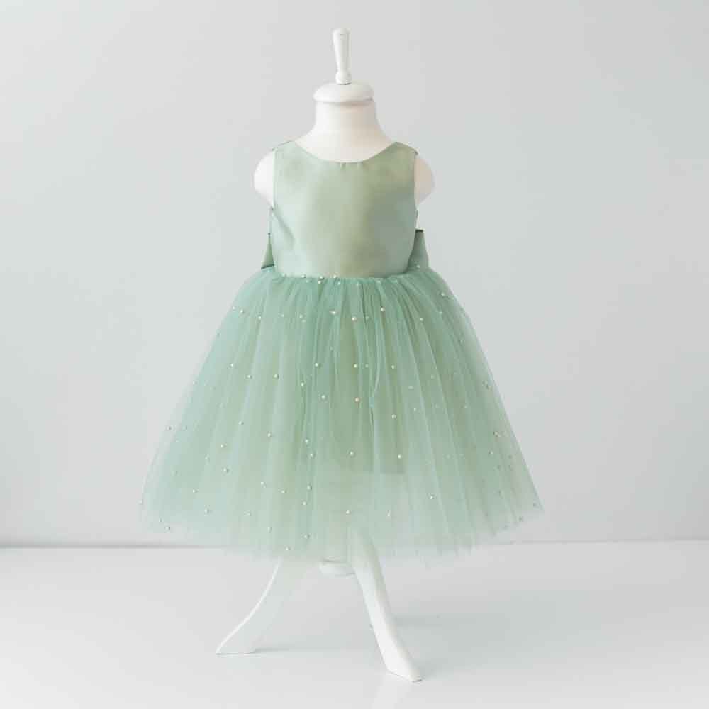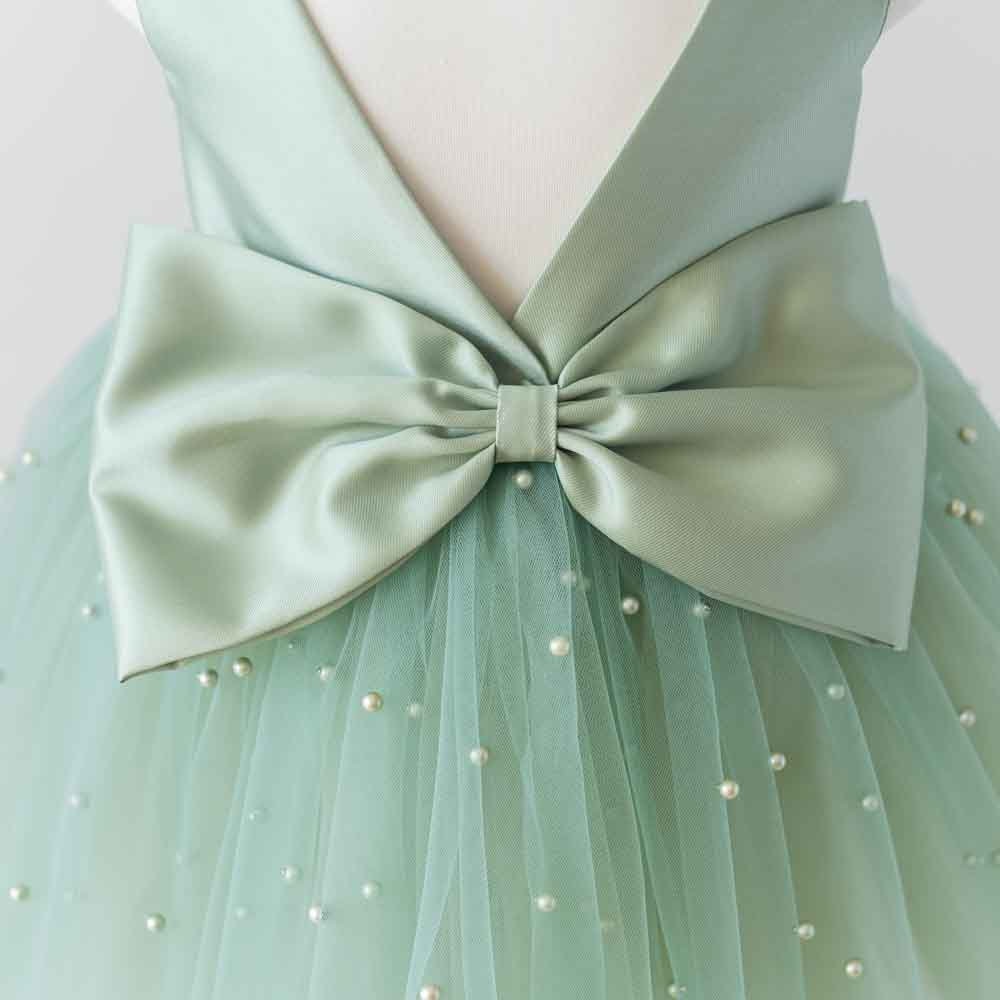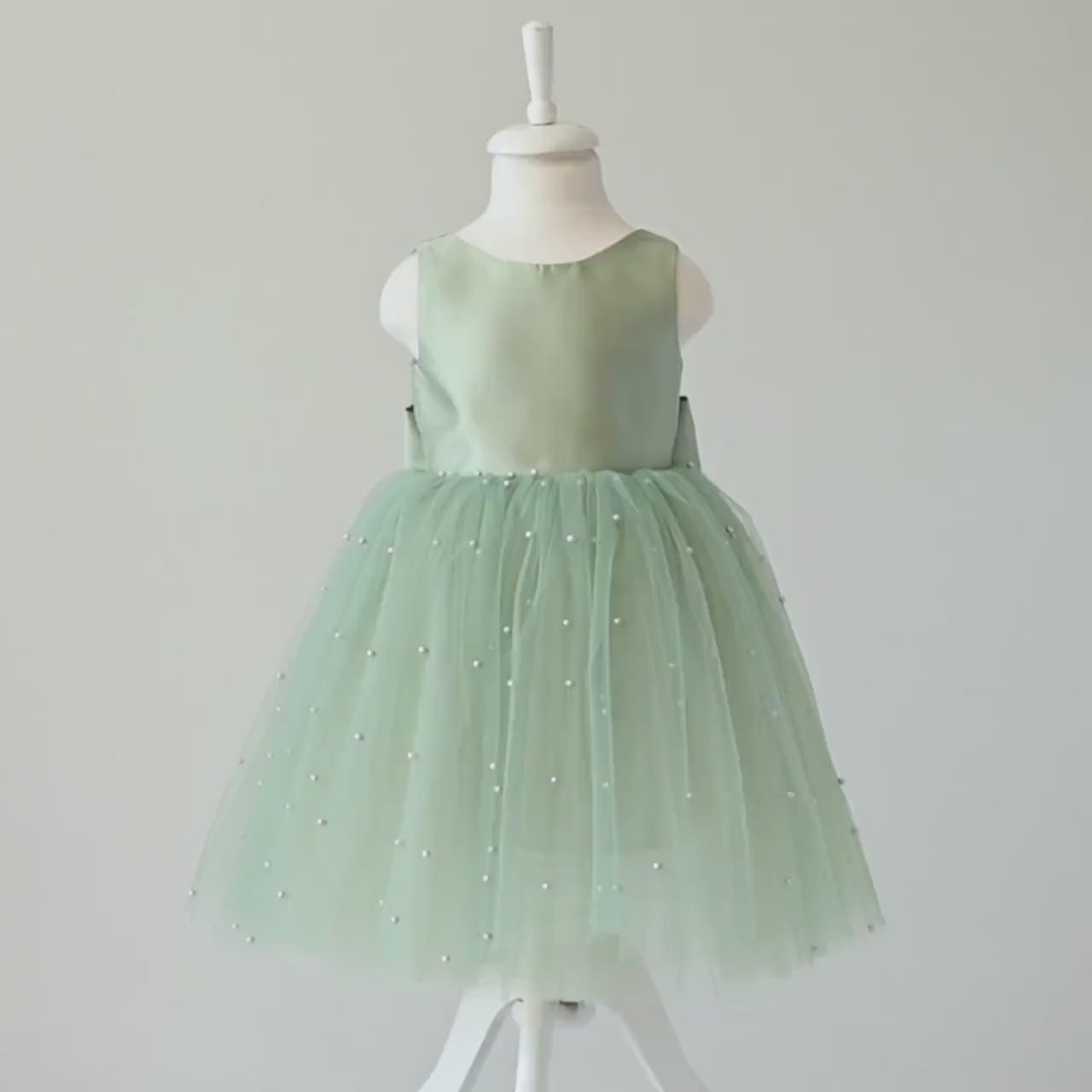 Bring a touch of natural elegance to your special day with this sage green tulle flower girl dress. Designed for weddings and celebrations, this dress features layers of soft, airy tulle in a dreamy sage hue, accented with delicate pearls across the bodice. The full skirt is perfect for twirling, while the gentle color complements rustic, boho, or garden-inspired themes.