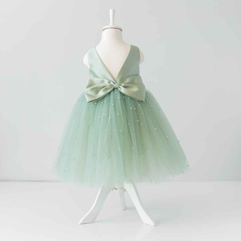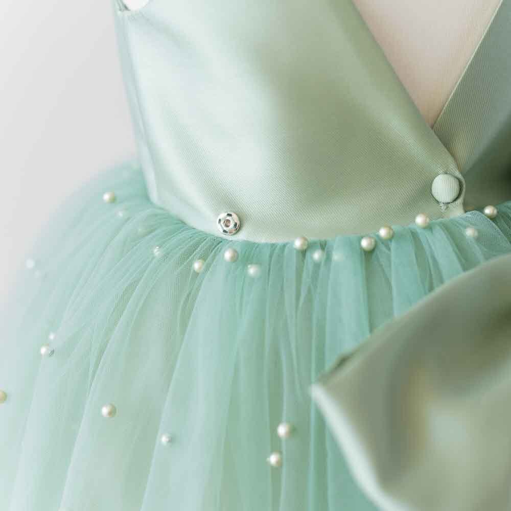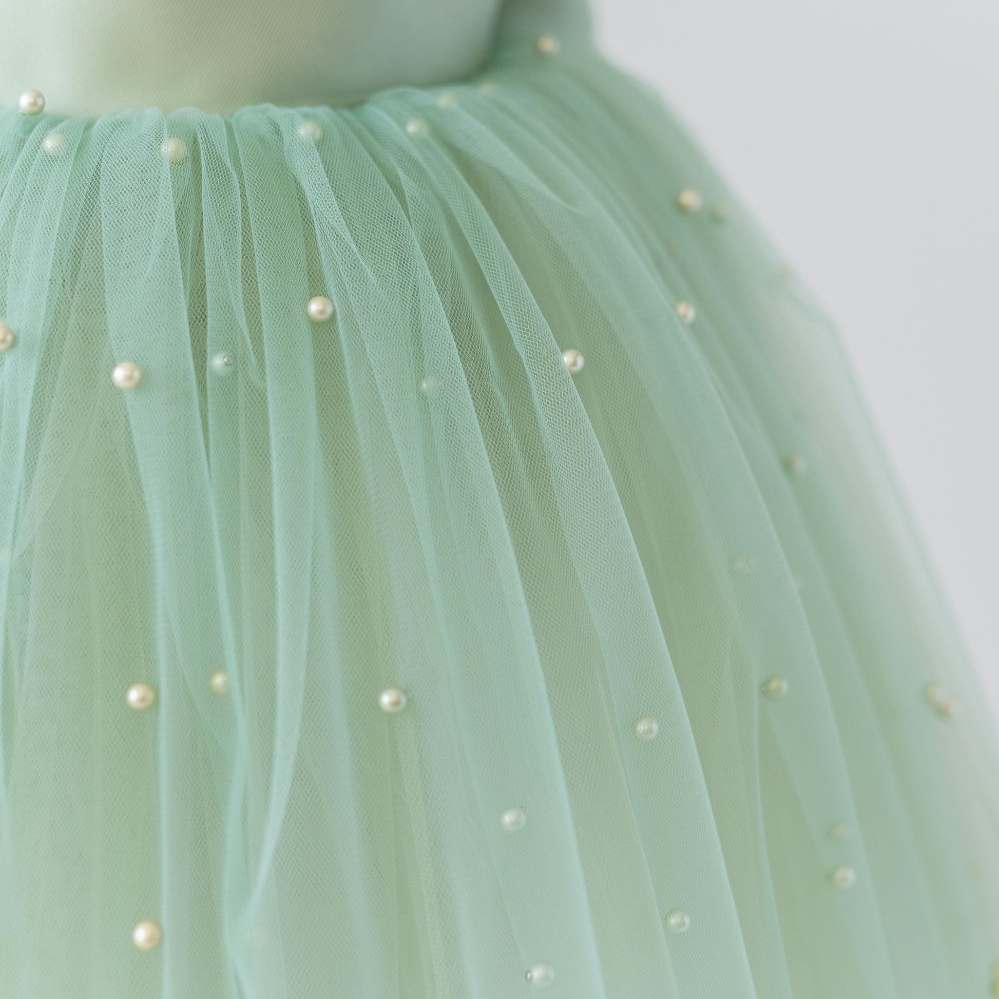 Bring a touch of natural elegance to your special day with this sage green tulle flower girl dress. Designed for weddings and celebrations, this dress features layers of soft, airy tulle in a dreamy sage hue, accented with delicate pearls across the bodice. The full skirt is perfect for twirling, while the gentle color complements rustic, boho, or garden-inspired themes.