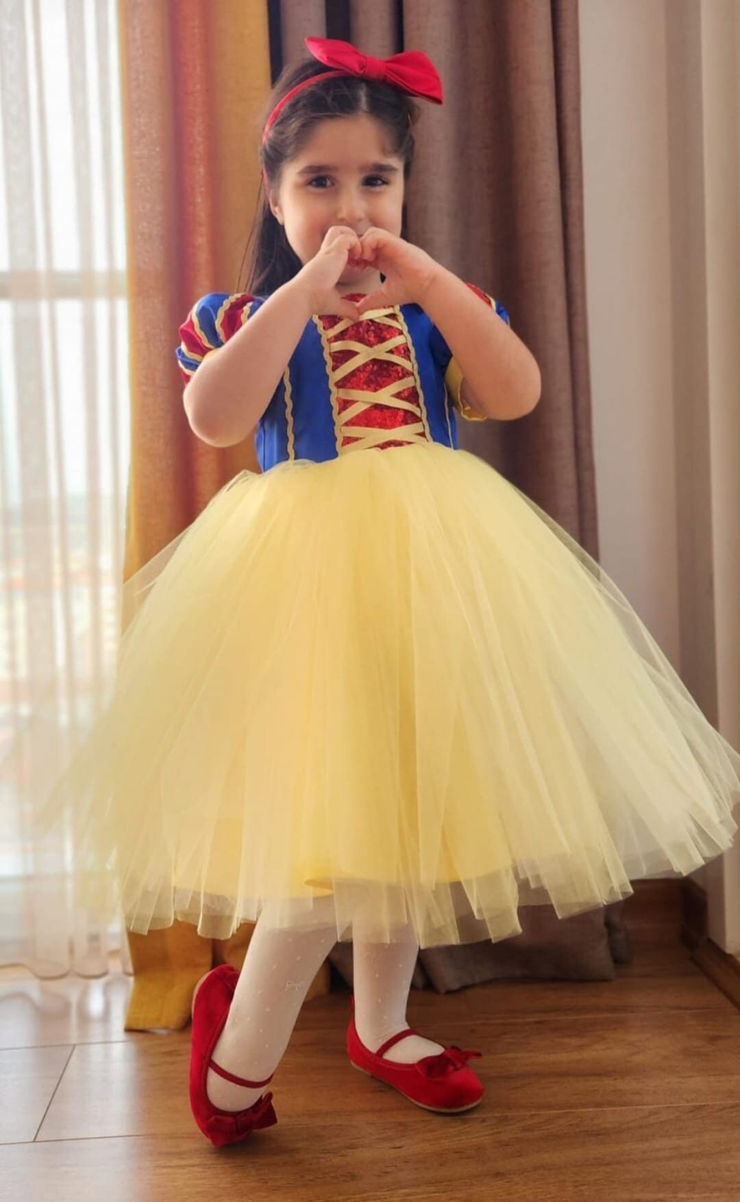 Let your little one step into a fairy tale with this enchanting Snow White birthday dress! Inspired by the classic princess, this costume features a vibrant blue bodice with gold trim, puffed sleeves, and a full yellow tulle skirt that’s perfect for twirling. The included red headband with a bow completes the magical look—ready for birthday parties, Halloween, dress-up play, or magical photo shoots.