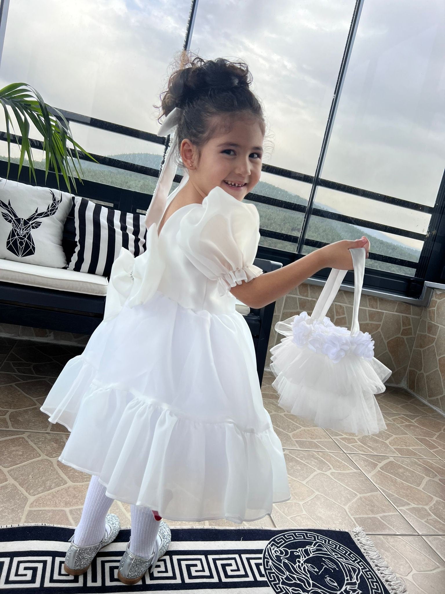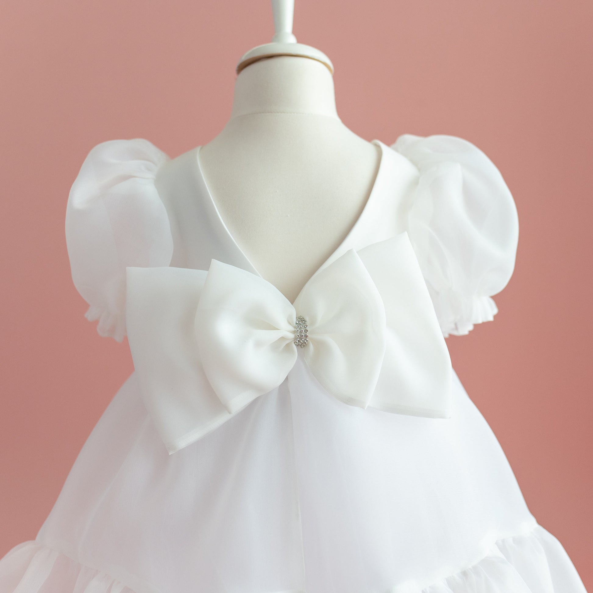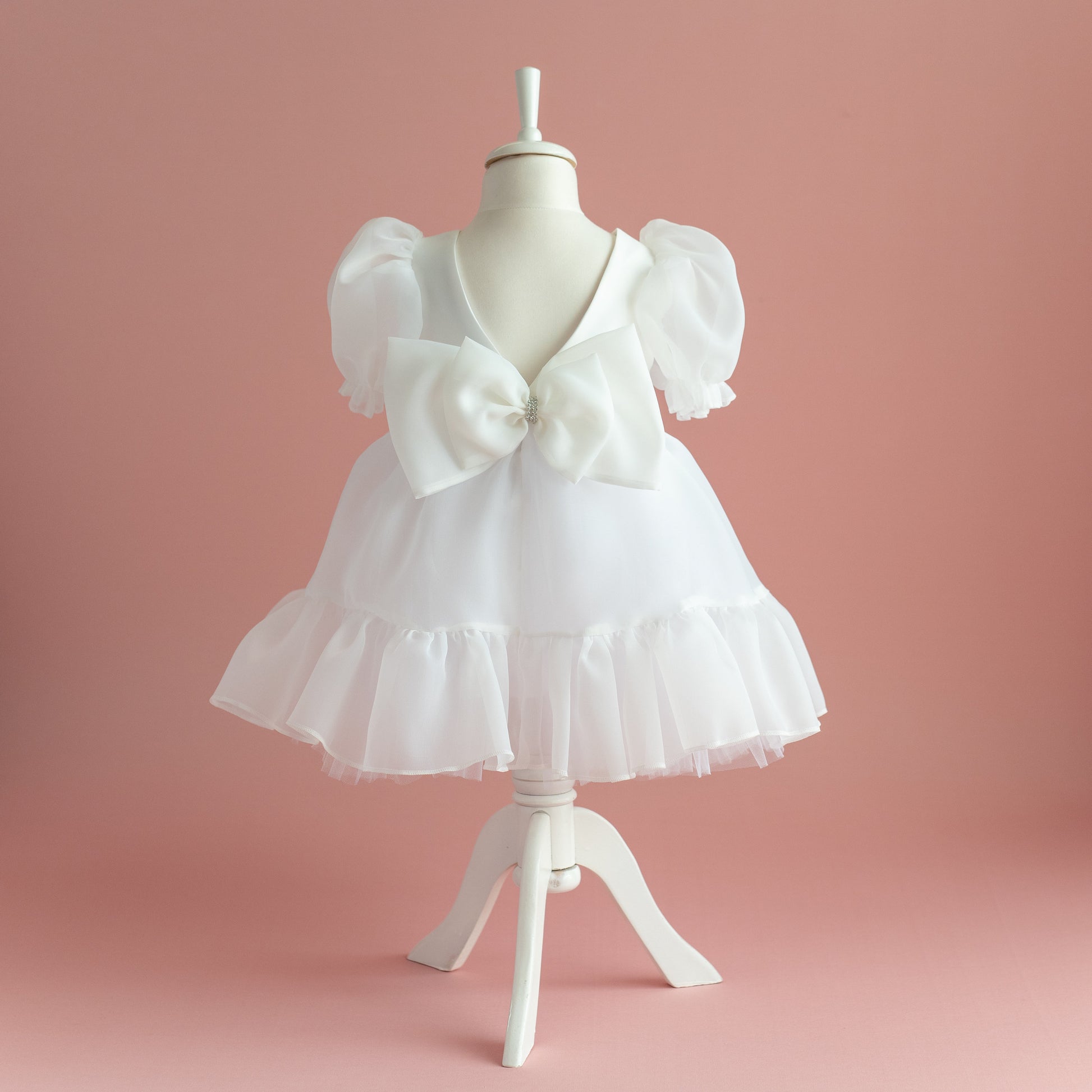 White Organza Flower Girl Dress with Bow – First Communion & Party Dress