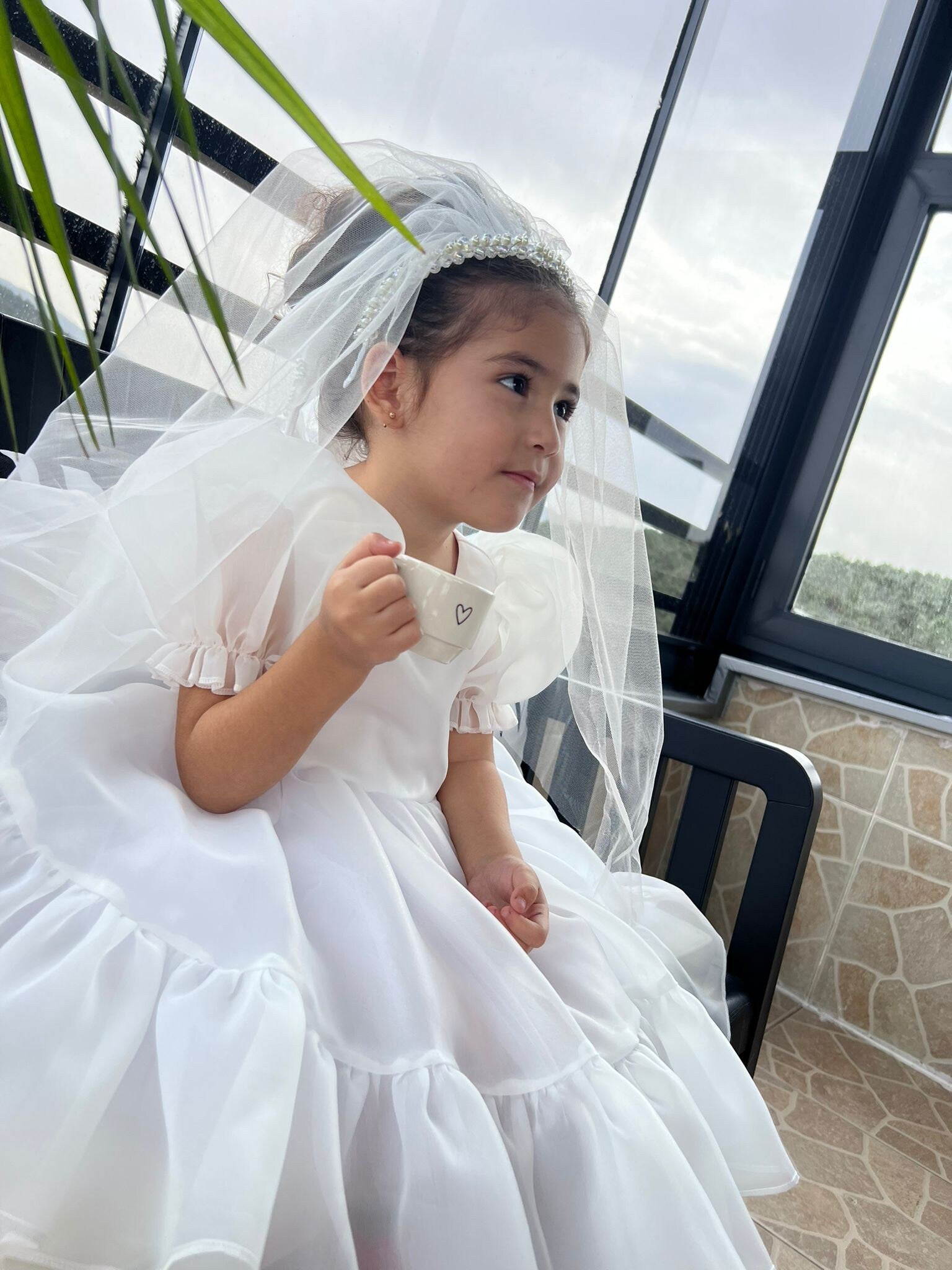 Make her special day sparkle with our White Organza Flower Girl Dress, featuring a charming bow and classic silhouette. This elegant party dress is designed for unforgettable moments—perfect for weddings, first communions, and joyful celebrations.