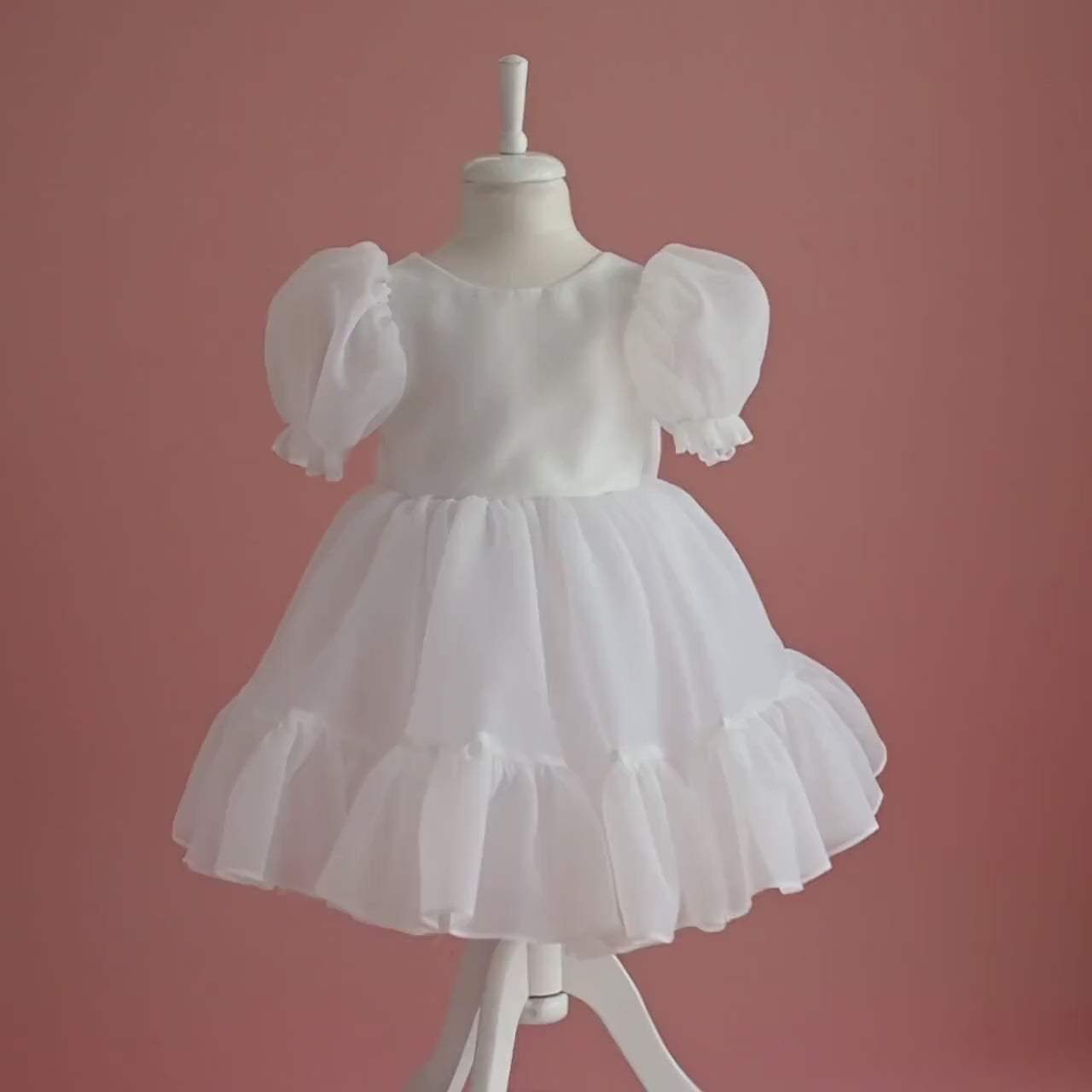 White Organza Flower Girl Dress with Bow: First Communion, Party Dress